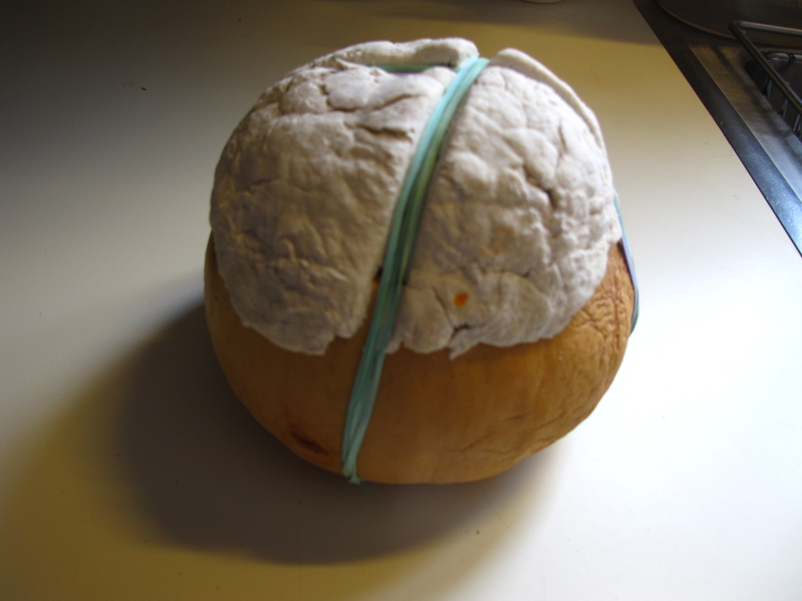 The first photo is the result of my first attempt to make the Pumpkin syrup and using the dough for covering the top(as it is in the original recipe). I have recognized that it is too complicated and later preferred to use the tape. Bellow is the picture of how the pumpkin looked after the required 10 days.